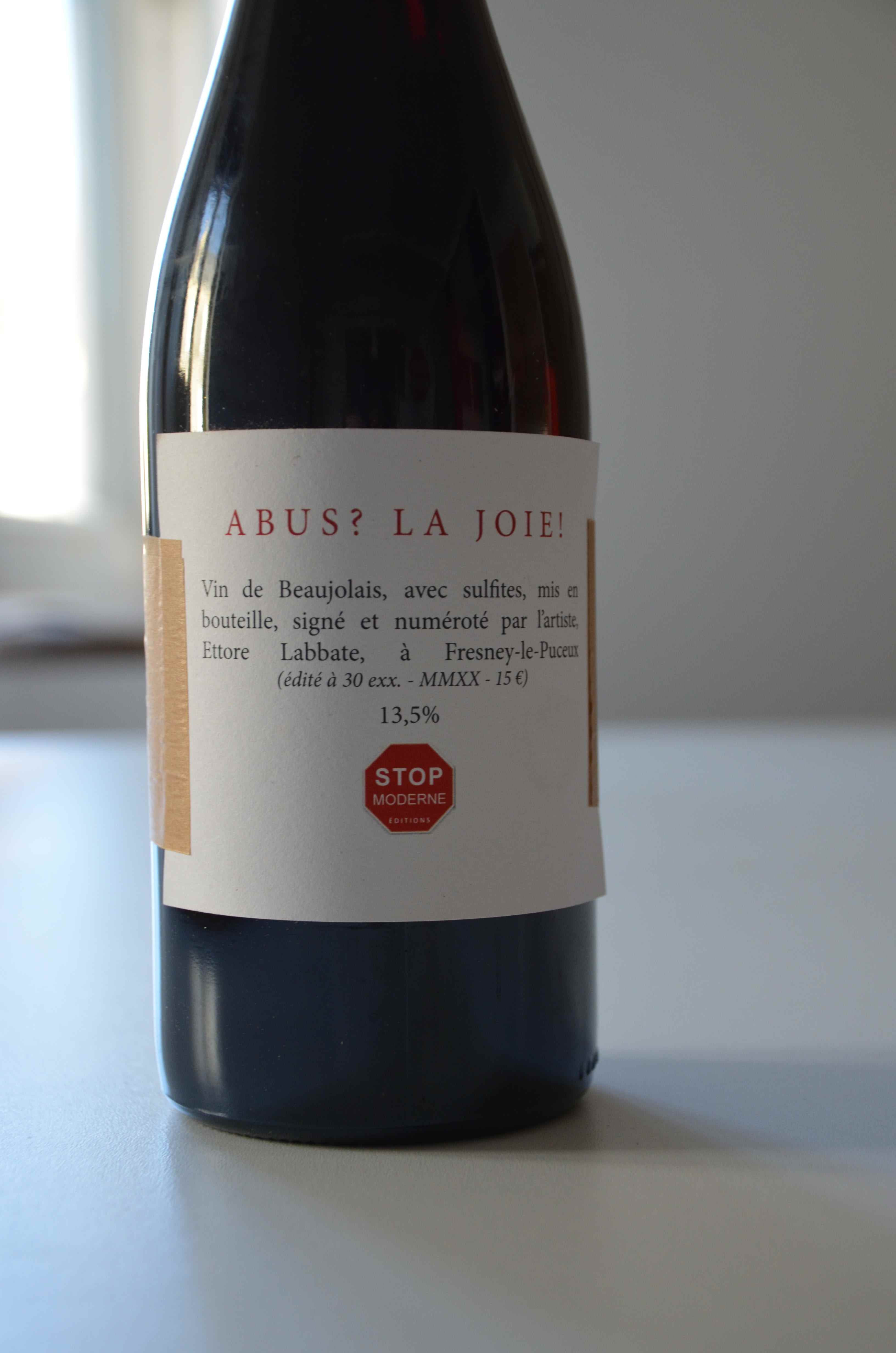 Vin rouge de la région du BEAUJOLAIS (dont l'anagramme donne le titre à l'édition) mis en bouteille par l'artiste dans son atelier : c'est une édition STOP MODERNE !
