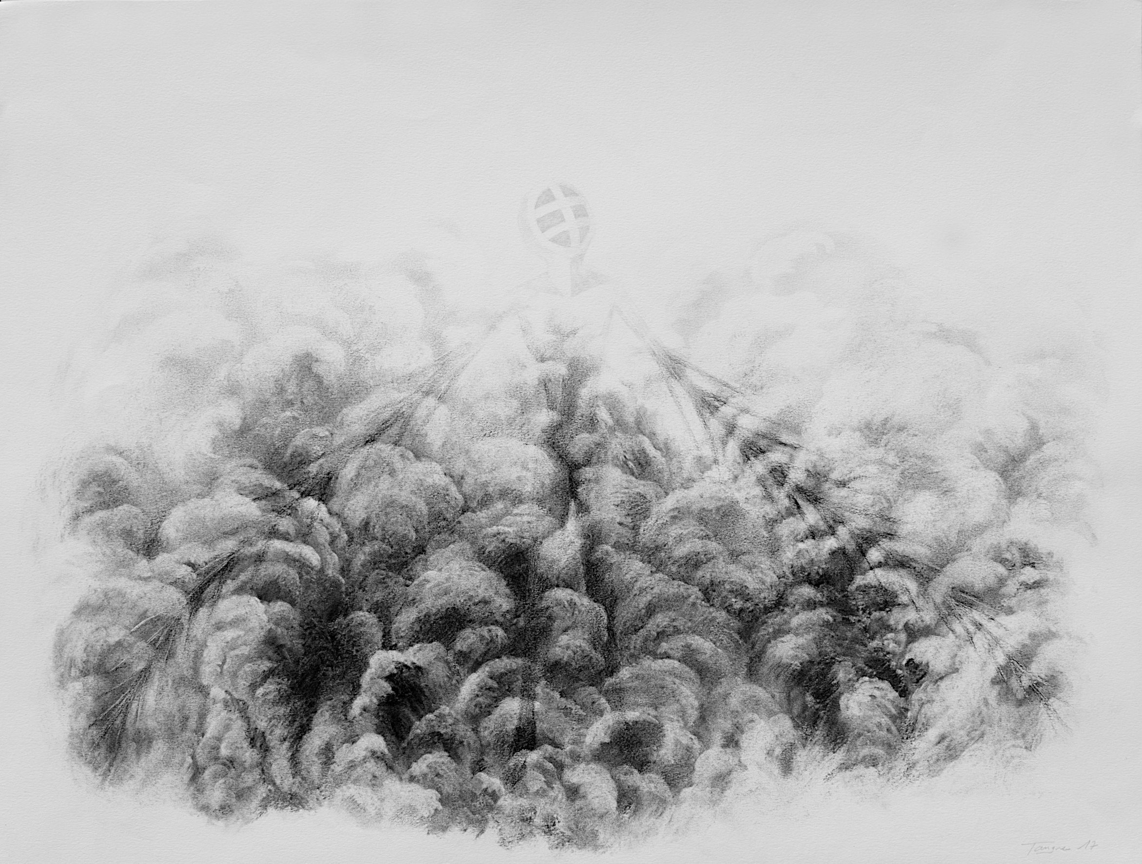 Les dessins autonomes et aboutis que je présente ici, sont comme des focus sur des fragments de l’univers qui est le mien depuis plusieurs années. Le fusain, le crayon graphite mais aussi la gomme, le blanc et le grain du papier agissent un peu comme le révélateur en photographie. Ils sont toujours les agents d’une mise au jour d’une image que j’ignorais et qui se débat entre ombre et lumière. Parfois encore mon travail au fusain se surprend à explorer la noirceur permise par un outil né d’une combustion et qui presque naturellement m’encourage à laisser libre cours à des images habitées par la fumée, le vent, le minéral, la cendre. Le gris et le noir du charbon ou la précision clinique du graphite conviennent à l’introspection comme un contrepoint lucide à la joie ou en tout cas à la vivacité exprimée dans mes peintures plus colorées.