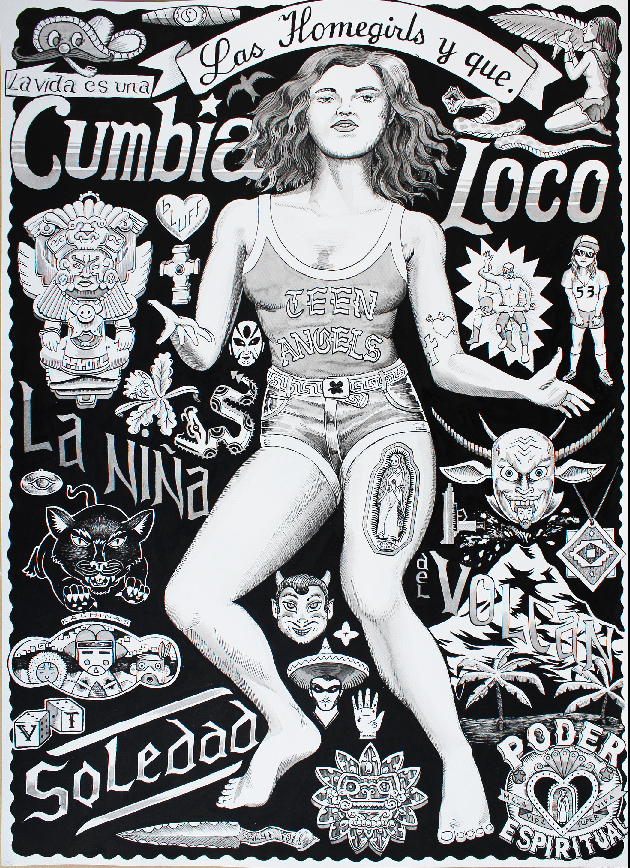 Cumbia Loco est un dessin réalisé à l'encre de chine ( plume et pinceau chinois) qui fait partie de la série "Music is energy". Cette série met en scène à chaque fois un ou plusieurs personnages centraux accompagnés d'une multitude de motifs qui viennent éclairer ou décliner la proposition dans des compositions dynamiques et saturées. Ces grands dessins s'inspirent notamment de mouvements musicaux spécifiques qui me tiennent à coeur et y accolent différentes références à l'univers de la culture populaire ( lettrages, affiches de concert, graphisme de skate, planche de tatouages ). Je poursuis dans cette série ce qui pourrait définir ma mythologie personnelle et dresser au fur et à mesure la carte d'un inconscient collectif, celui d'une humanité en mouvement, résistant à la normalisation et à l'apathie, pour qui la passion est mode de vie.