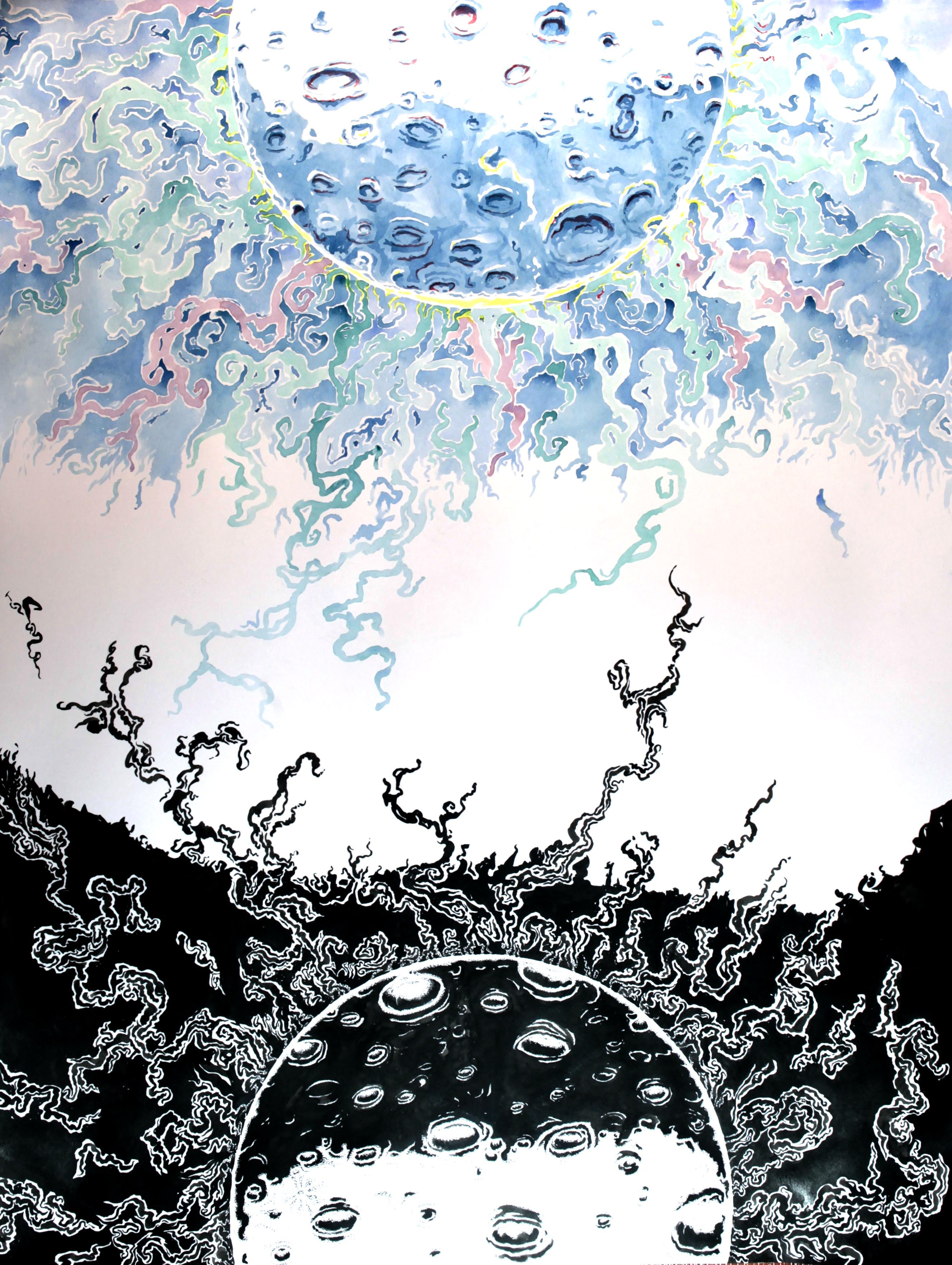 Entre deux mondes, encre de chine et aquarelle. Cette pièce fait partie de la série "Bring Color into my life", discussion entre un monde noir-blanc et un constitué de couleur.