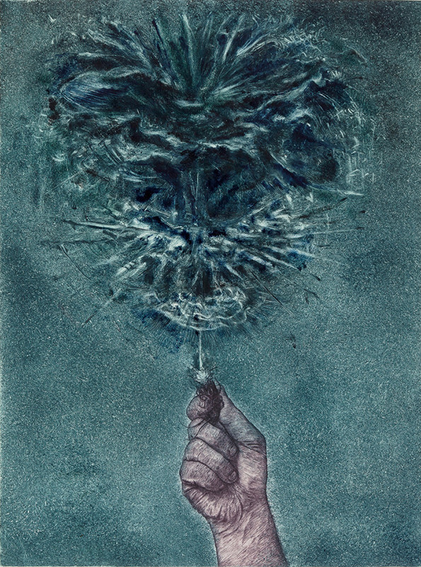 La main pince un cafard duquel jaillissent des formes peintes, libres et colorées. Cette action absurde est une détonation déclenchant de multiples expériences picturales. Chaque image est pour moi l’occasion d’expérimenter dans la peinture et le dessin les dynamiques, les forces, les énergies de ces diverses « éruptions » de matière : tourbillons, explosions, jaillissements, effervescences, nébulosités, éclosions, etc. Le cafard n’a aucune signification, il n’est qu’un vecteur amorçant l’absurde, un déclic provoquant le libre déploiement de formes peintes qui n’existent que pour ce qu’elles sont : leur plasticité.