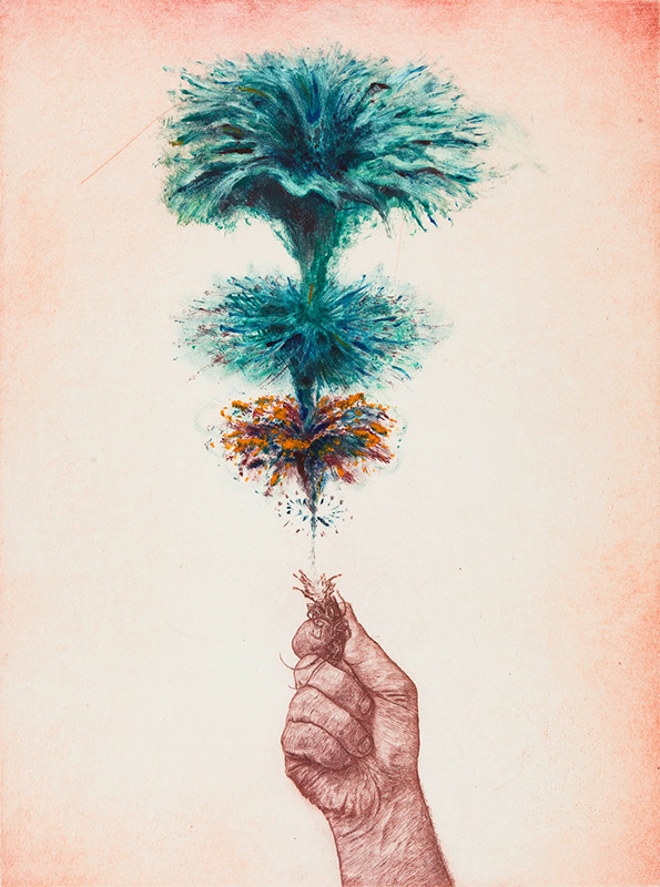 La main pince un cafard duquel jaillissent des formes peintes, libres et colorées. Cette action absurde est une détonation déclenchant de multiples expériences picturales. Chaque image est pour moi l’occasion d’expérimenter dans la peinture et le dessin les dynamiques, les forces, les énergies de ces diverses « éruptions » de matière : tourbillons, explosions, jaillissements, effervescences, nébulosités, éclosions, etc. Le cafard n’a aucune signification, il n’est qu’un vecteur amorçant l’absurde, un déclic provoquant le libre déploiement de formes peintes qui n’existent que pour ce qu’elles sont : leur plasticité.