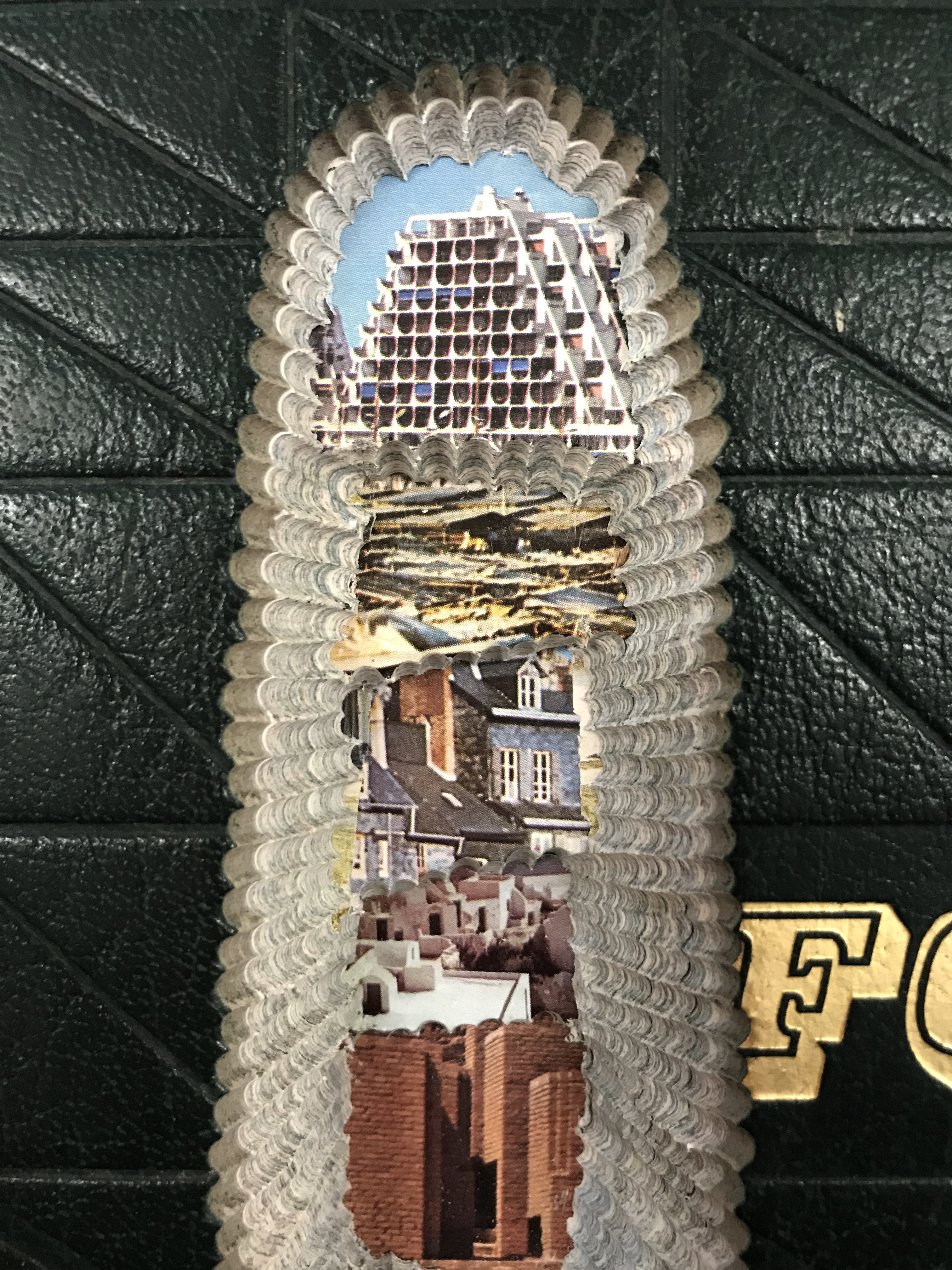 Archéologie livresque réalisée dans l’encyclopédie Focus. Les livres sont fouillés comme des carrières à ciel ouvert. Les creux réalisés à la gouge laissent apparaître, sur plusieurs étages, des images comportant des constructions dont l’état fait écho aux mutations de nos paysages contemporains. L’œuvre est vendue avec son socle mural 18 x 6 x 10,5 cm.