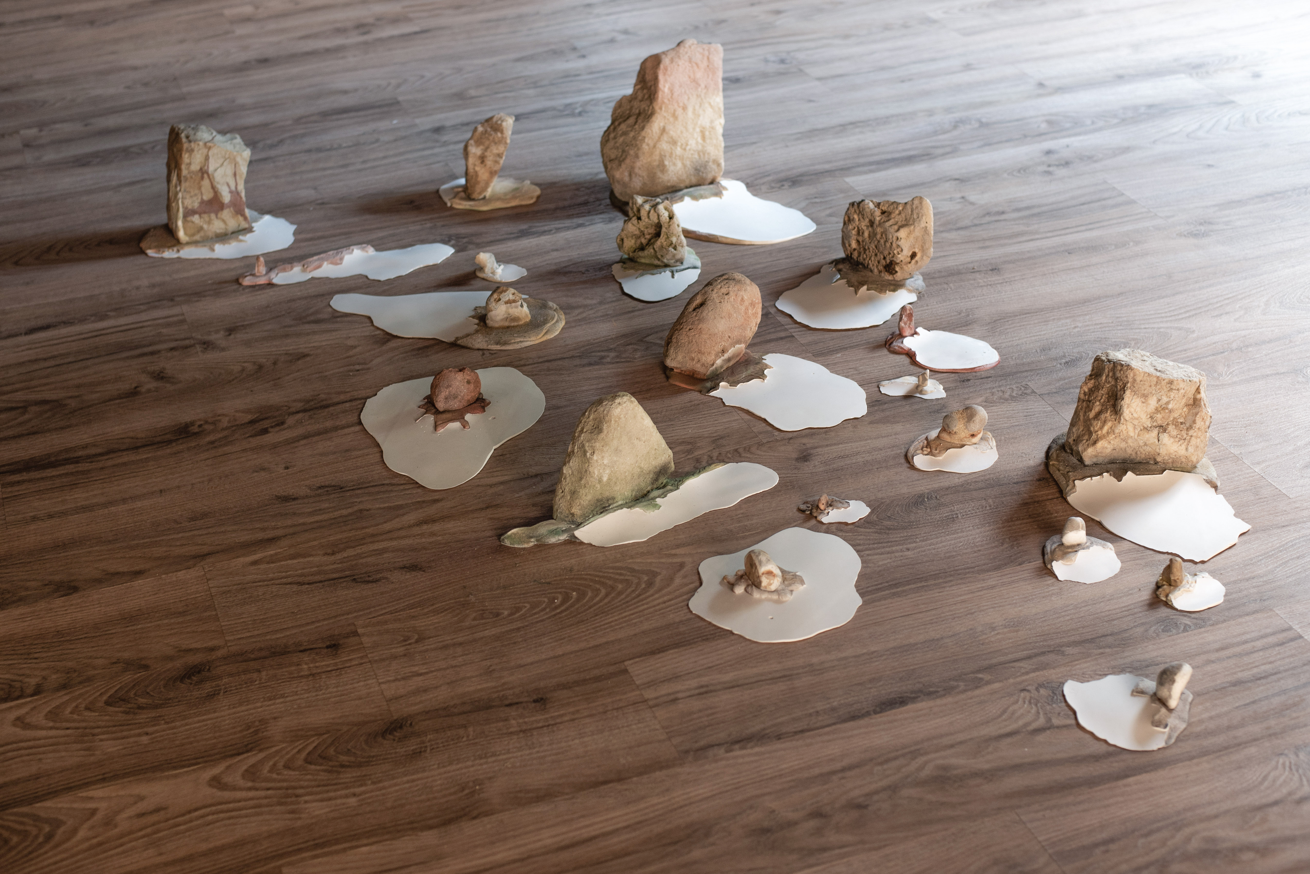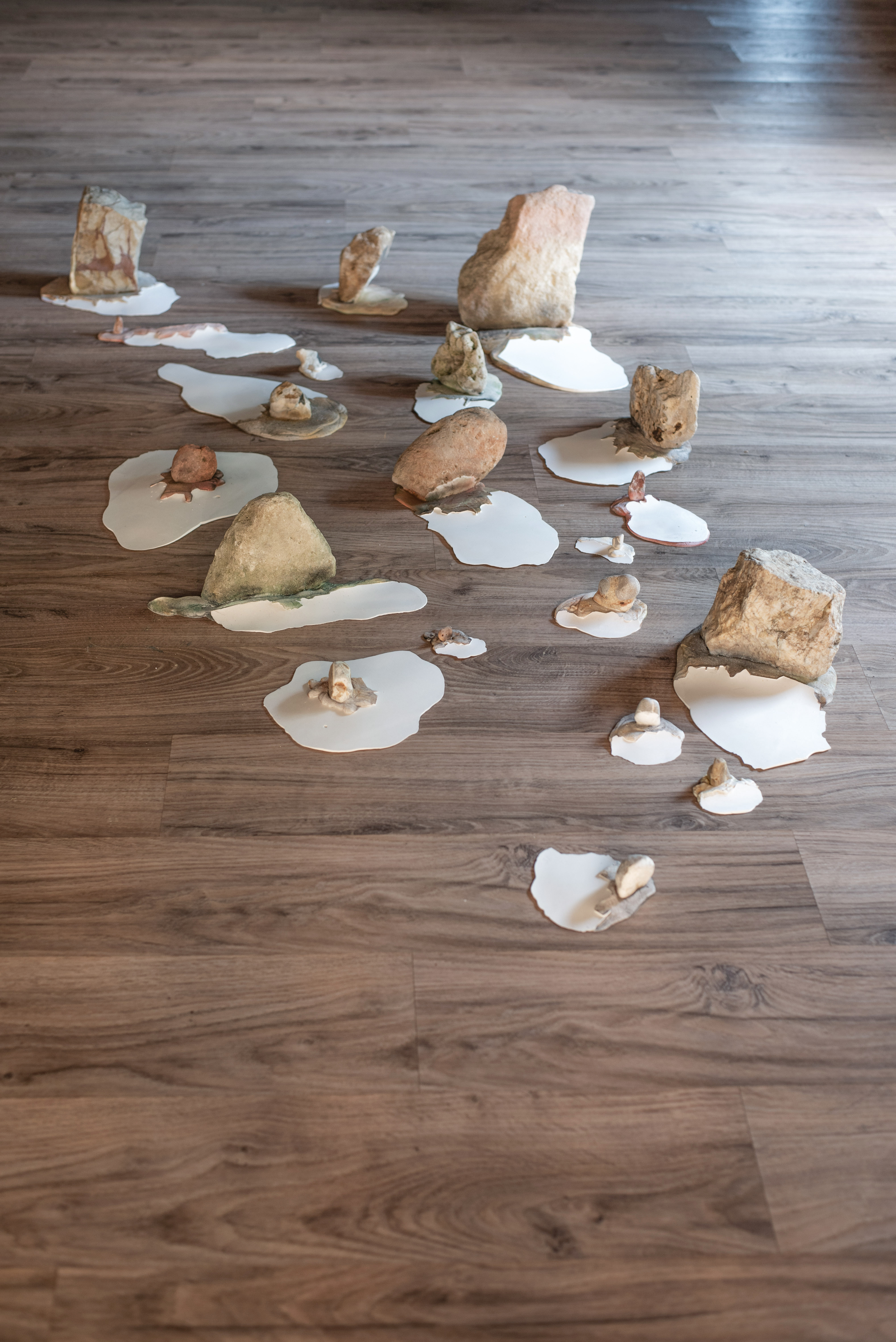 Dimensions variables.Lorsque les cœurs de pierre fondent en larmes. Le blanc lisse consomme la chaleur des couleurs. Le regard sensible est mis en veille jusqu’à ce que cette bataille entre la vague d’un lac au repos et ses pigments en grains de sable se déclare.
