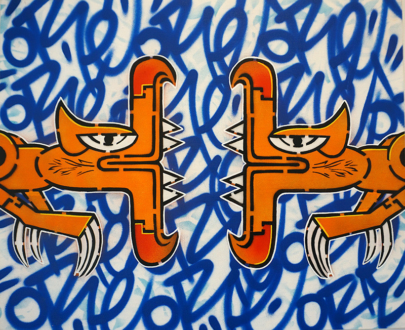 For a decade, he tagged cities across Europe. Traveling in Mexico in the 2000's, he discovered Quetzalcoatl, the Aztec god which is portrayed as a feathered serpent. This mythological icon became an essential feature of his pictorial universe.