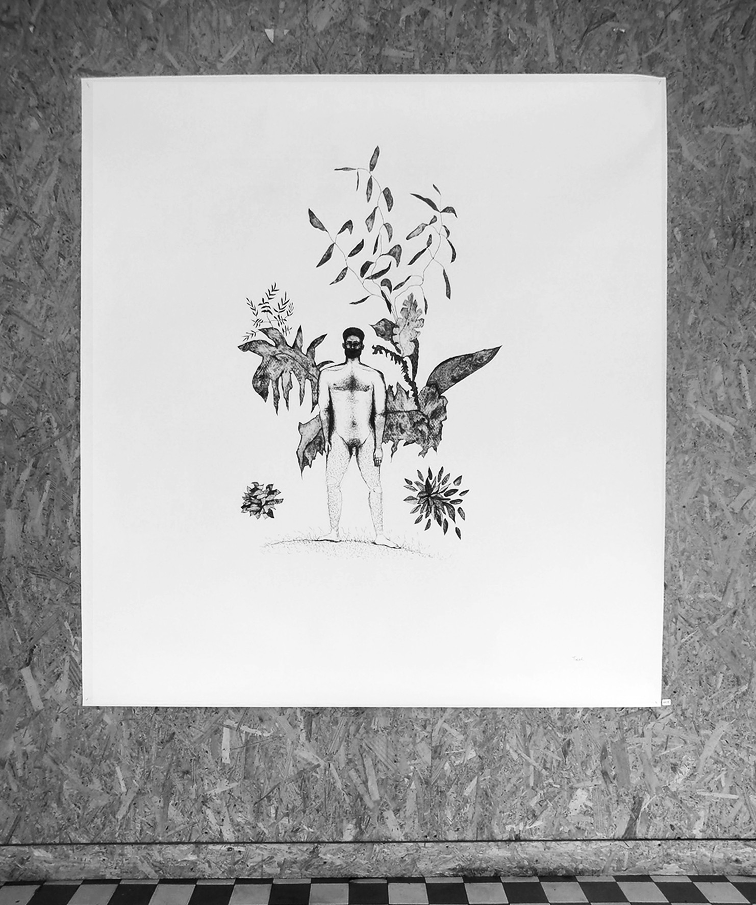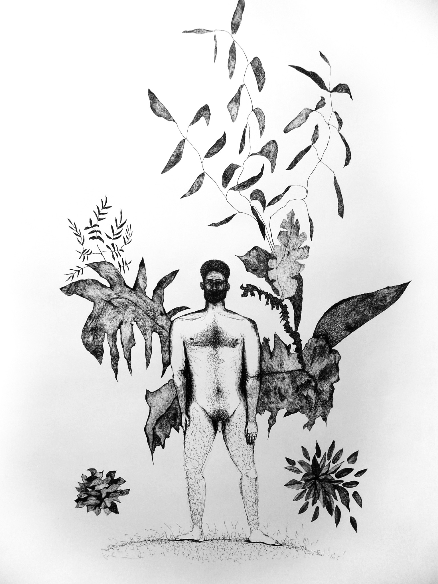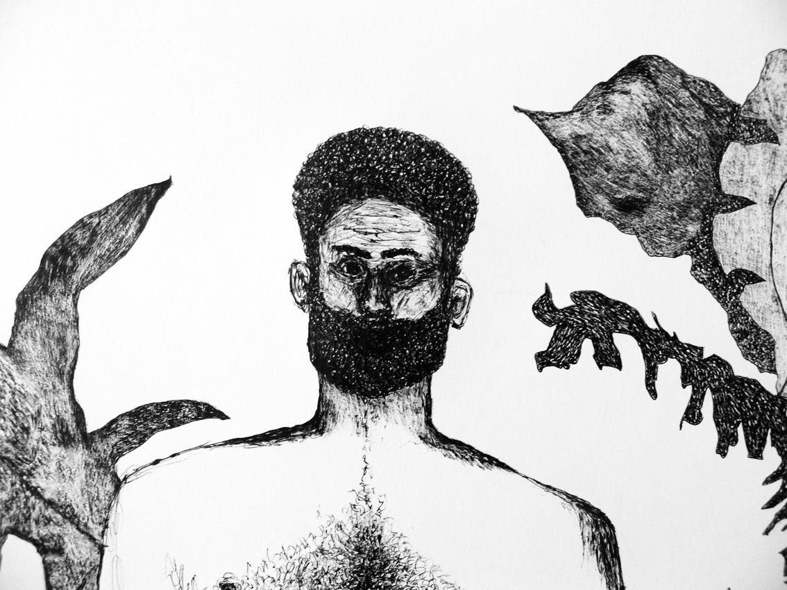 Dans la spontanéité du geste, dans l'écoute du corps et de l'intuition, c'est l'empreinte du sauvage que j'imprime sur le papier. La représentation d'un monde archaïque, où la nudité va de paire avec l'innocence, me permet d'explorer la partie primitive de mon humanité, l'homme à l'état de nature.