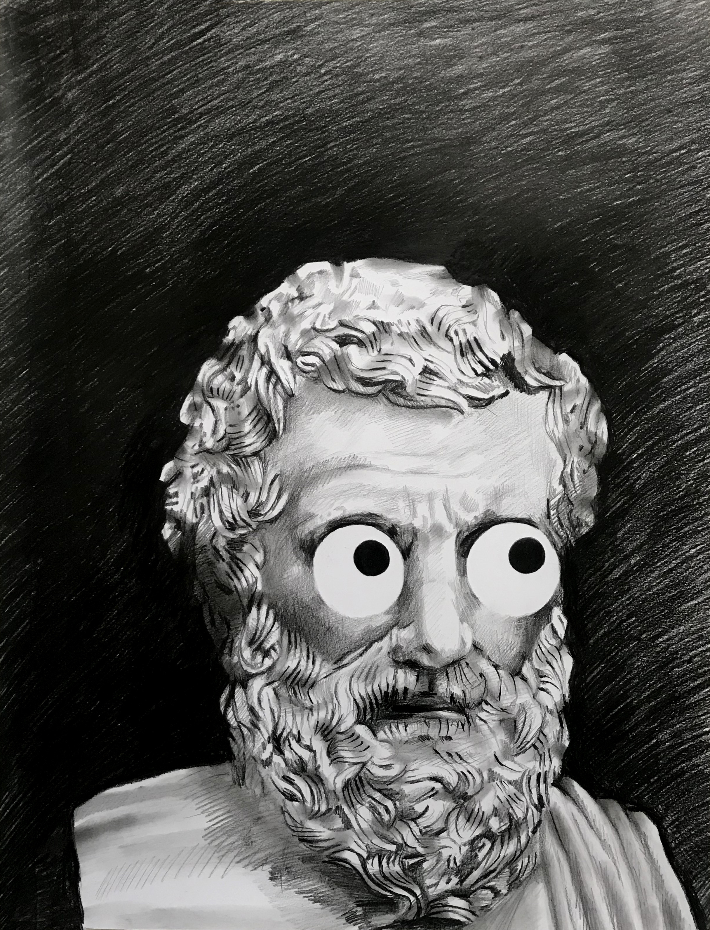 La mine absurde, Emilie Breux associe des figures canoniques de l’histoire de l’art (natures mortes, sculptures antiques) à des formes naïves (smiley, dessin d’enfant) pour en offrir une lecture aussi humoristique qu’irrévérencieuse. Le contraste pro- duit entre un travail de fond technique, sinon virtuose, et les manques au premier plan, en creux desquels apparaissent les figures pauvres, donne ici l’impression d’un acte vandale réalisé à l’aide d’un logiciel de retouche, qui déloge la peinture classique de son piédestal. Dans un même temps, l’utilisation du smiley confère également une certaine vitalité à la représentation initiale, en lui donnant l’occasion d’une nouvelle incarnation plus en phase avec le vocabulaire de l’époque. Symboles d’un nouveau langage, fait d’emojis, de pictogrammes et de logos, les titres des œuvres prennent enfin la forme d’émoticônes, accentuant ainsi la tension entre norme picturale et iconographie populaire.