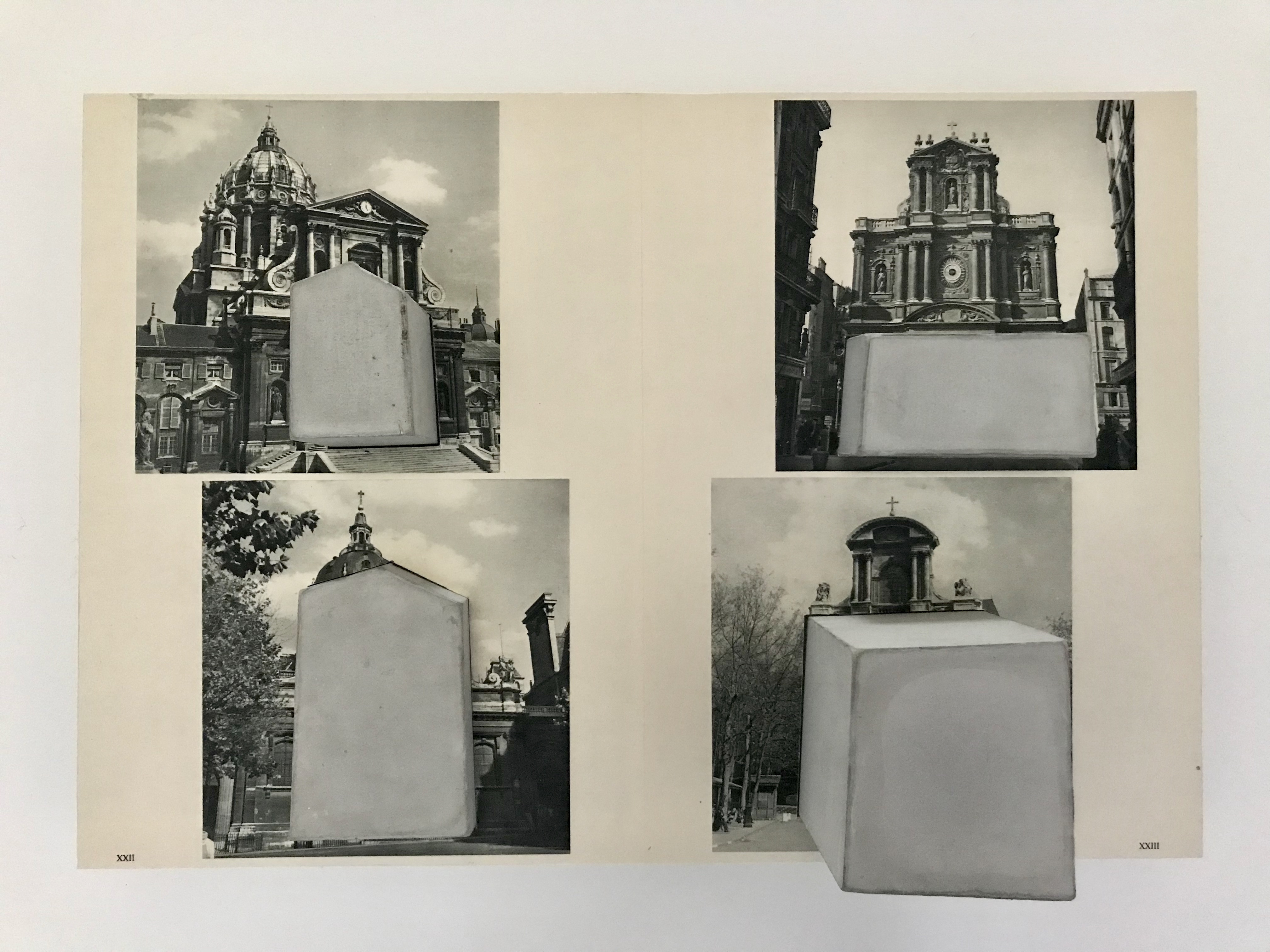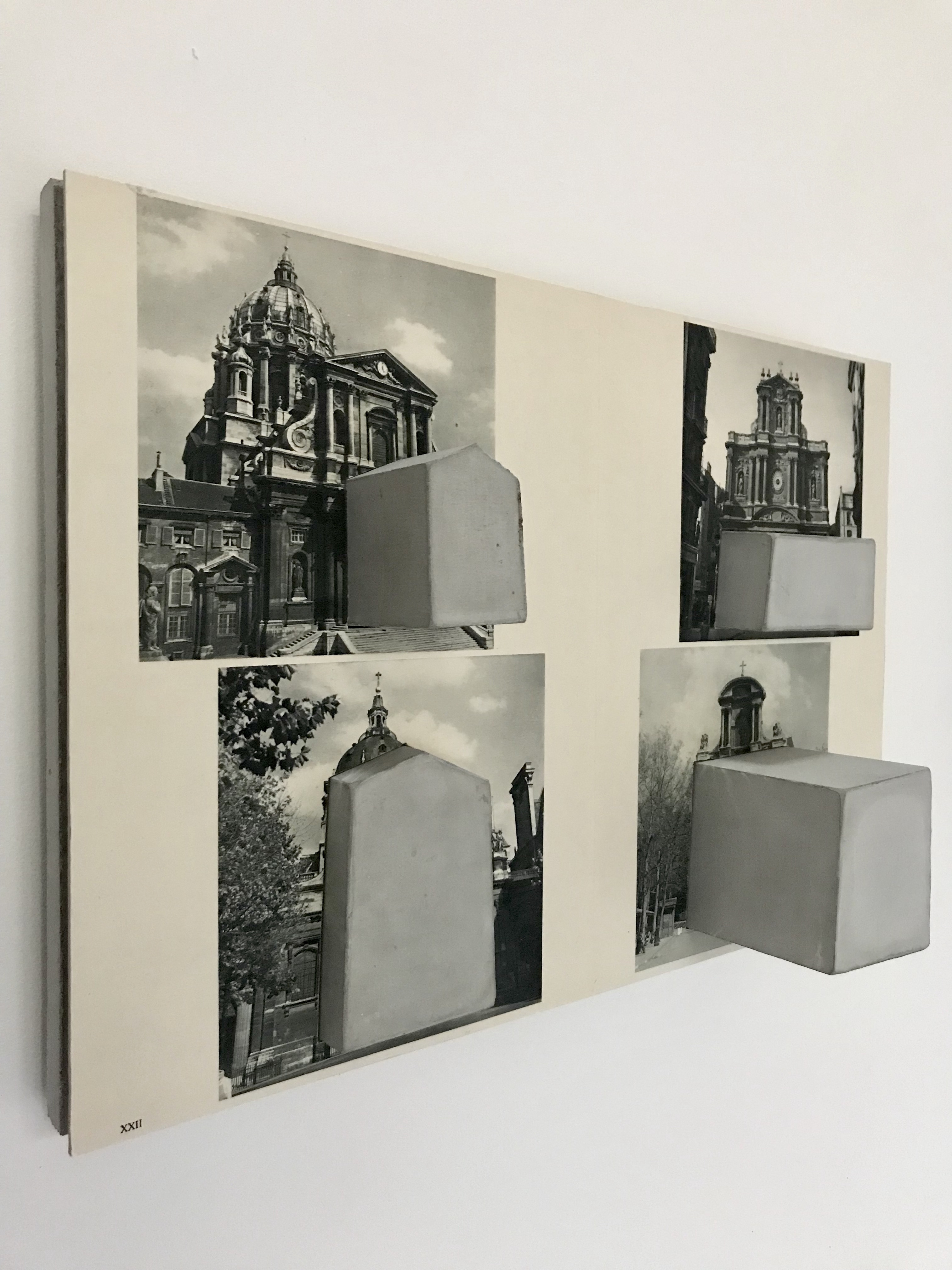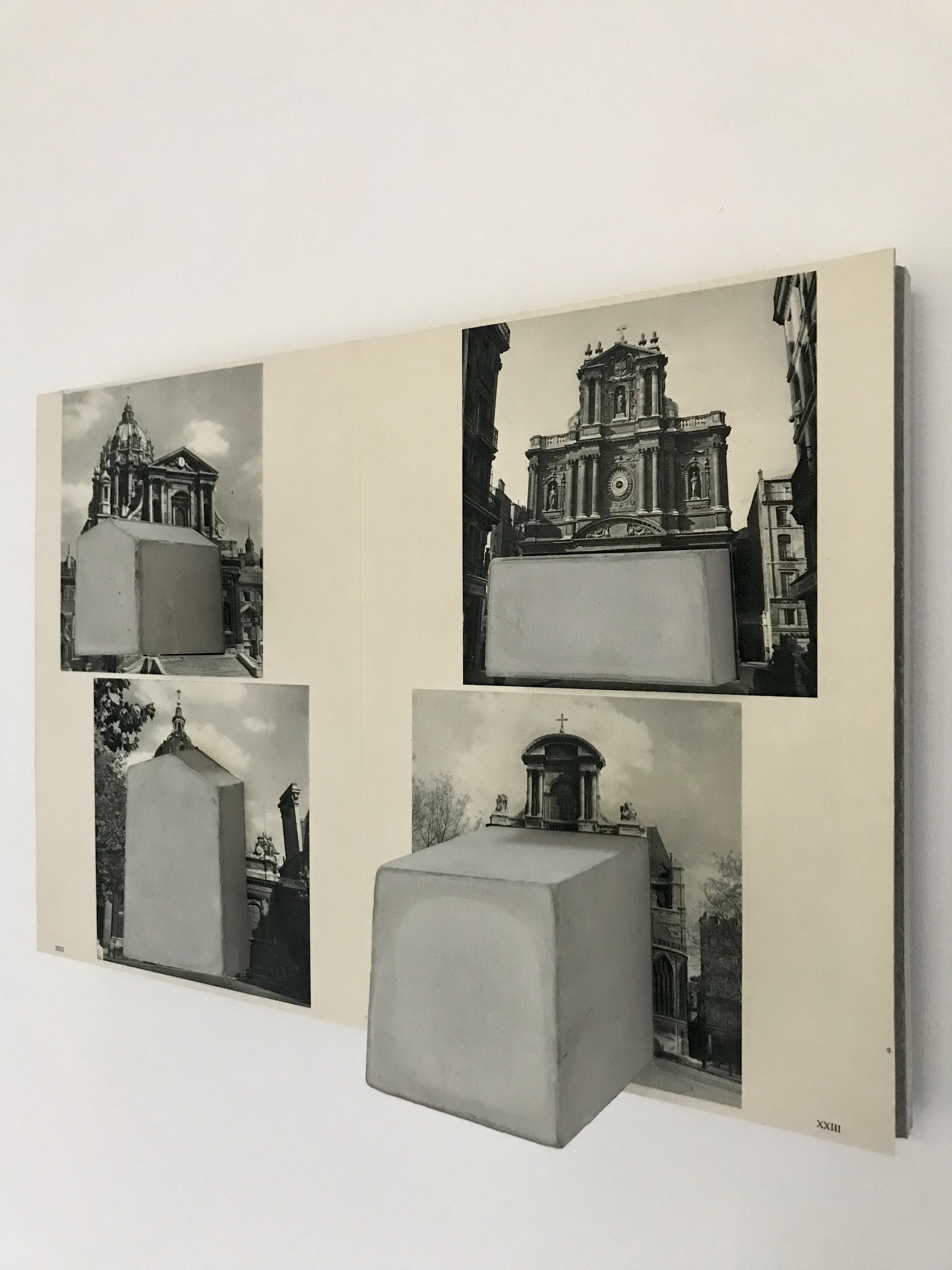 Encyclopédie Alpina Illustrée de Paris augmentée de ciment. L’œuvre est constituée d’une plaque de ciment 20mm avec un système de fixation murale, quatre blocs de ciment à visser, un document photographique percé contrecollé sur un carton gris 3mm.
