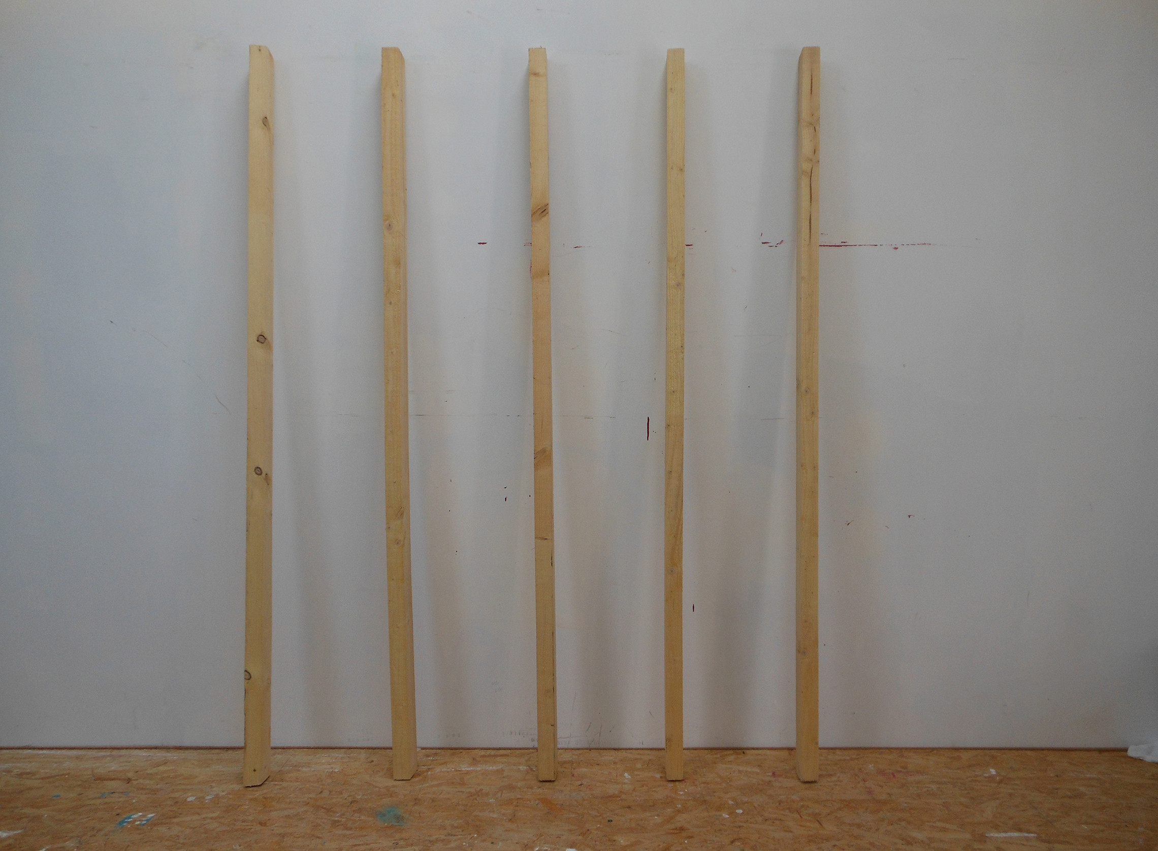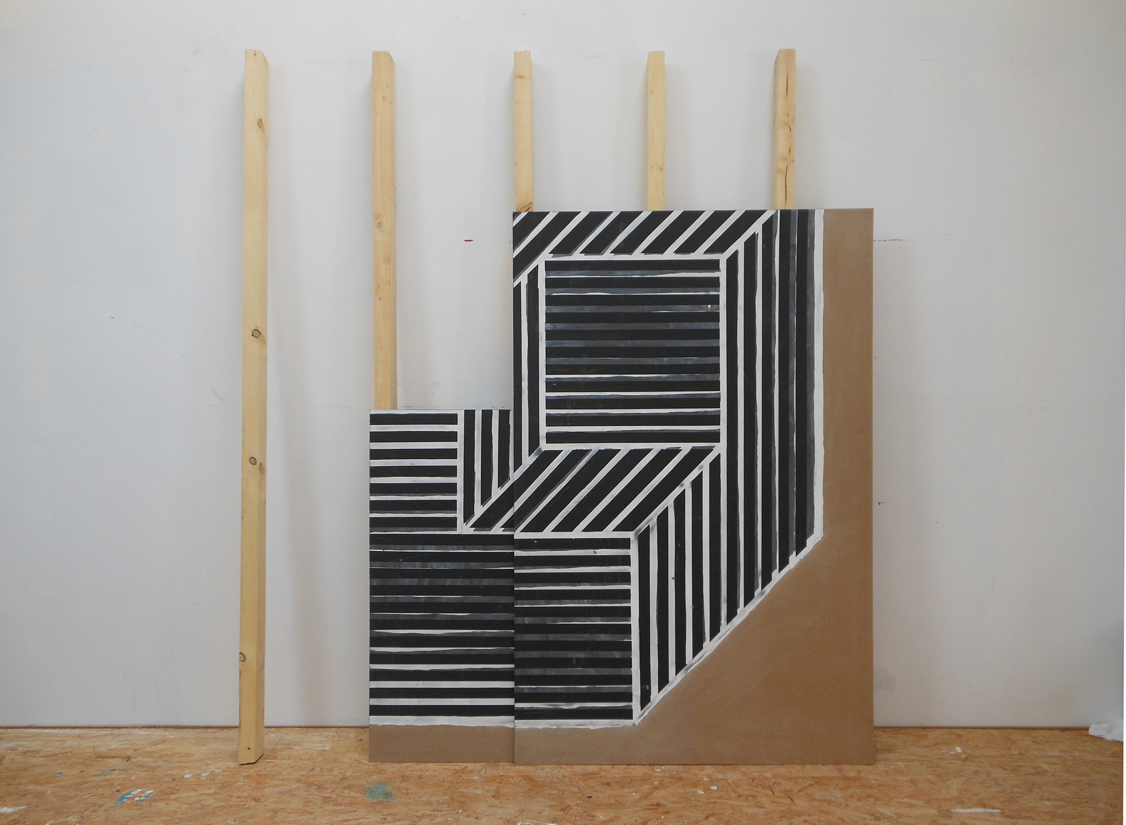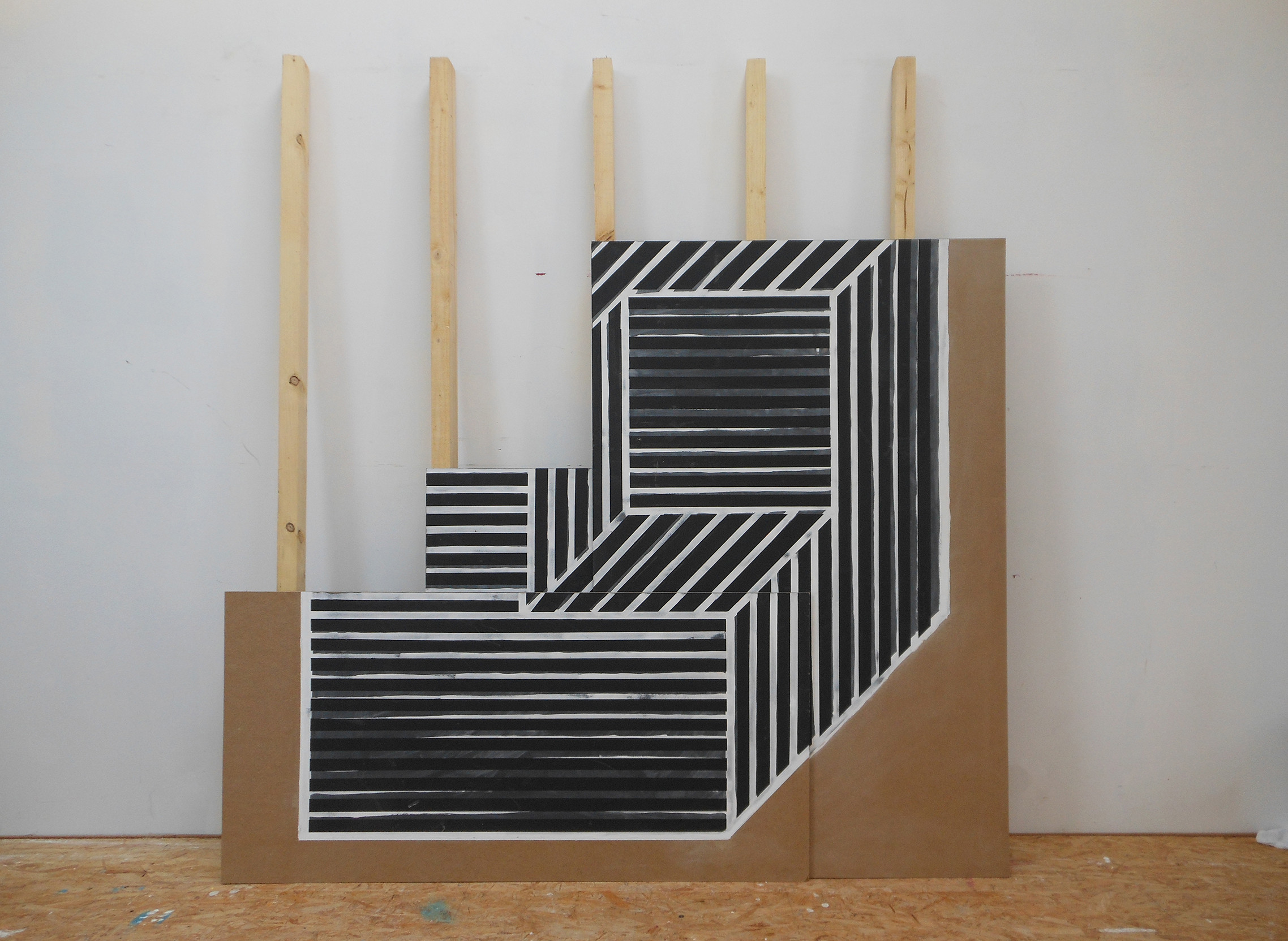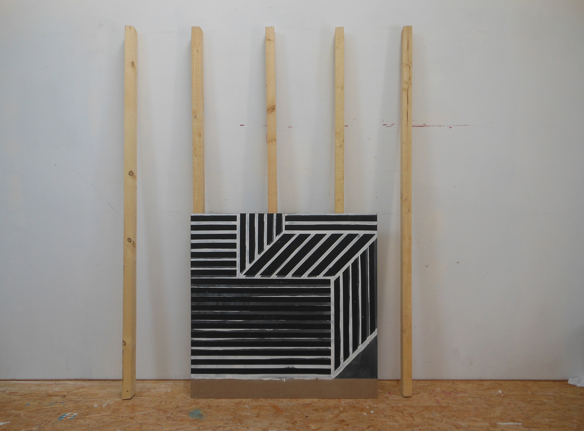 Cette installation est composée de panneaux MDF superposés et adossés à des chevrons, ces éléments de construction sont abandonnés contre un mur.Comme une image rémanente, la superposition des plaques reconstitue «Cube without a cube» d'après Sol LeWitt.