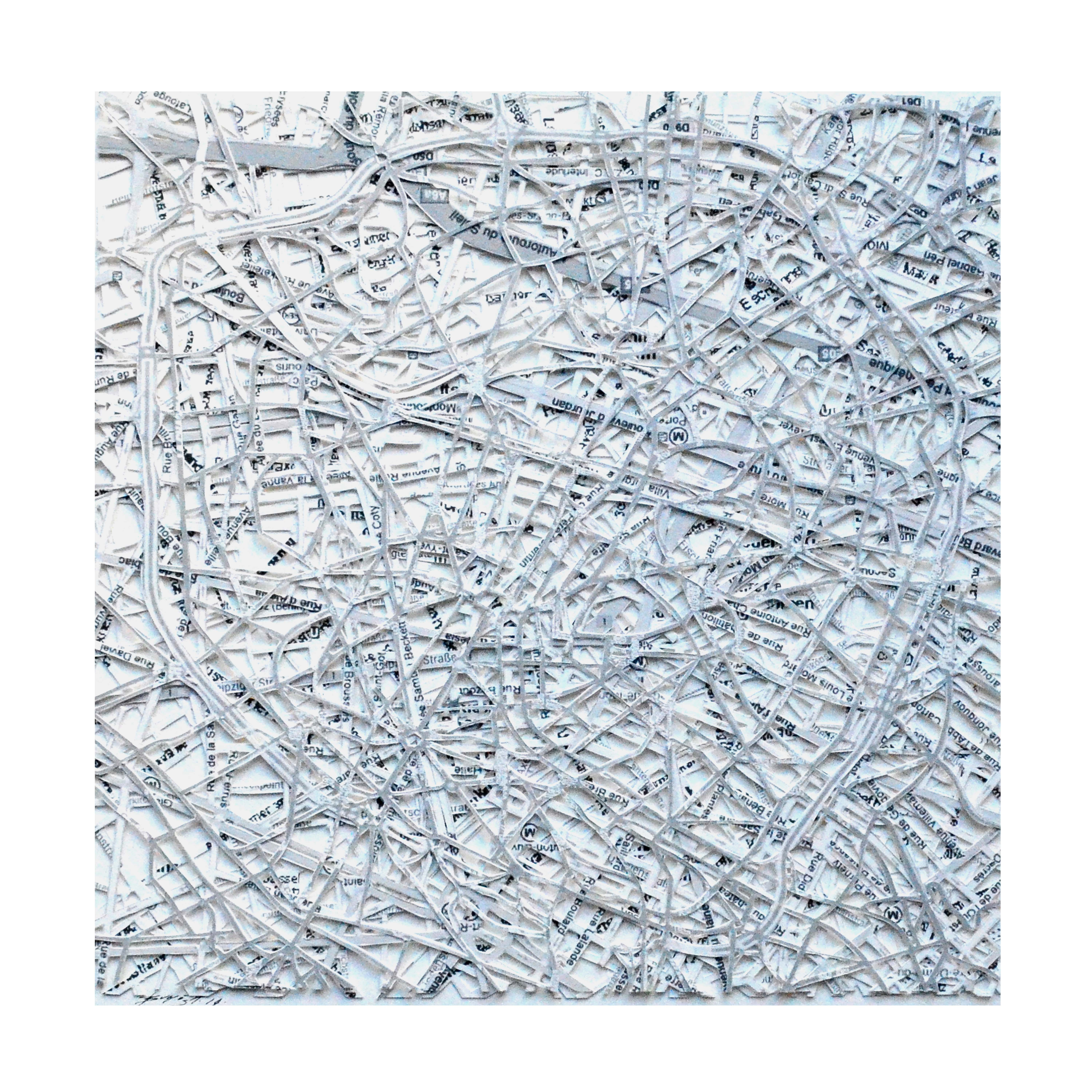 Série «MAP» La série Map est un travail débuté en 2014. Je déforme des cartes et plans du monde entier avant de les agresser au scalpel, symbole d’un monde de chaos et de destins brisés, pour ne garder que les lieux de circulation.A l'intérieur de la grande Histoire, j’interroge les petites histoires et les destins individuels.Je mixe, superpose ces ravages de papier dans une volonté de reconstruction. Cette cartographie originale semble vouloir tracer de nouvelles lignes individuelles où chacun pourra insuffler par son empreinte un nouveau rapport au monde.Cette série se décline sous forme de tableaux «bas reliefs», sculptures et installations. Pièce Unique - Oeuvre encadrée et sous verre bois brut clair