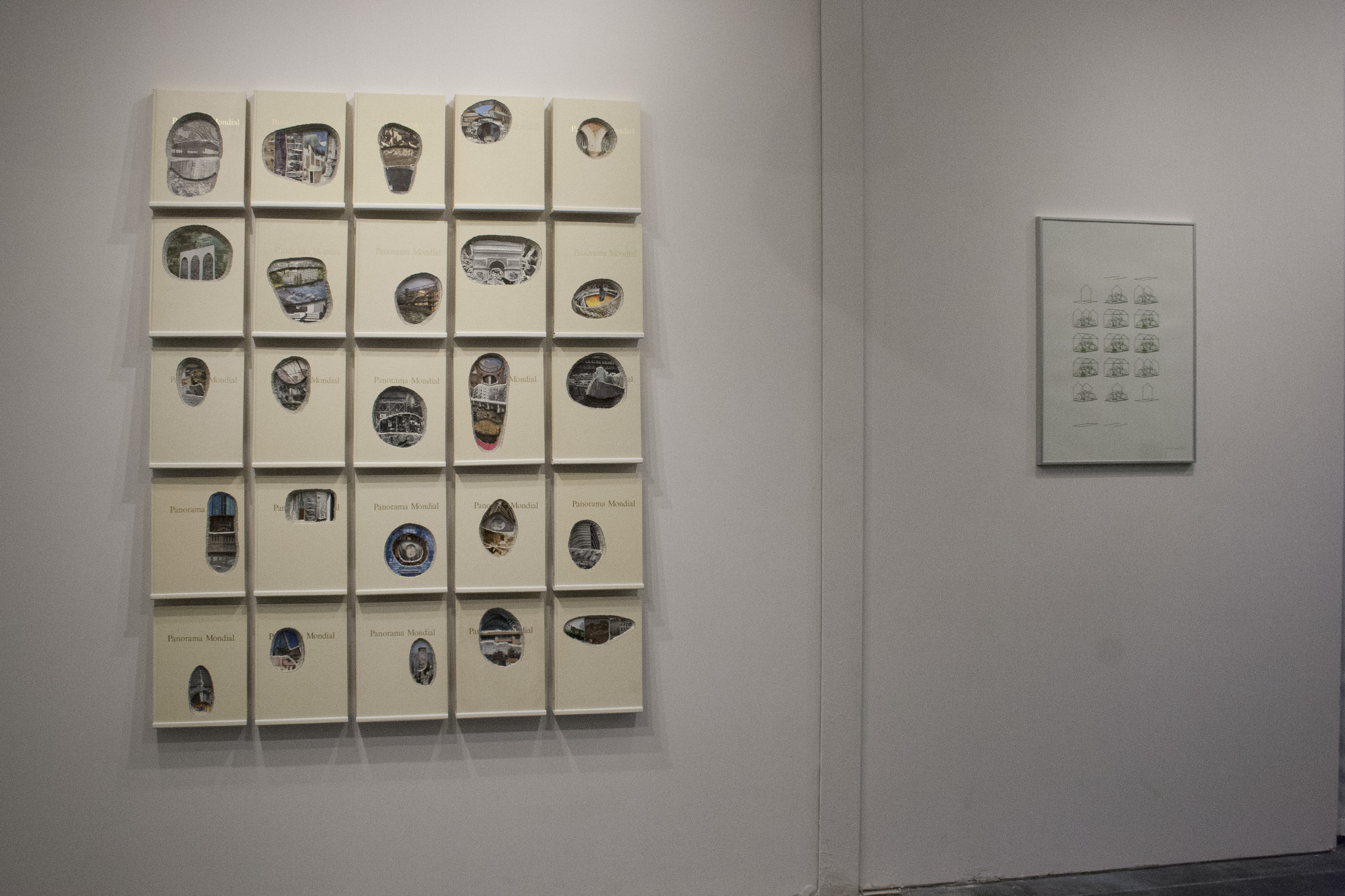 Archéologie livresque réalisée dans l’encyclopédie Panorama mondial. Les livres sont fouillés comme des carrières à ciel ouvert. Les creux réalisés à la gouge laissent apparaître, sur plusieurs étages, des images comportant des constructions dont l’état fait écho aux mutations de nos paysages contemporains. L’œuvre est vendue avec son socle mural.