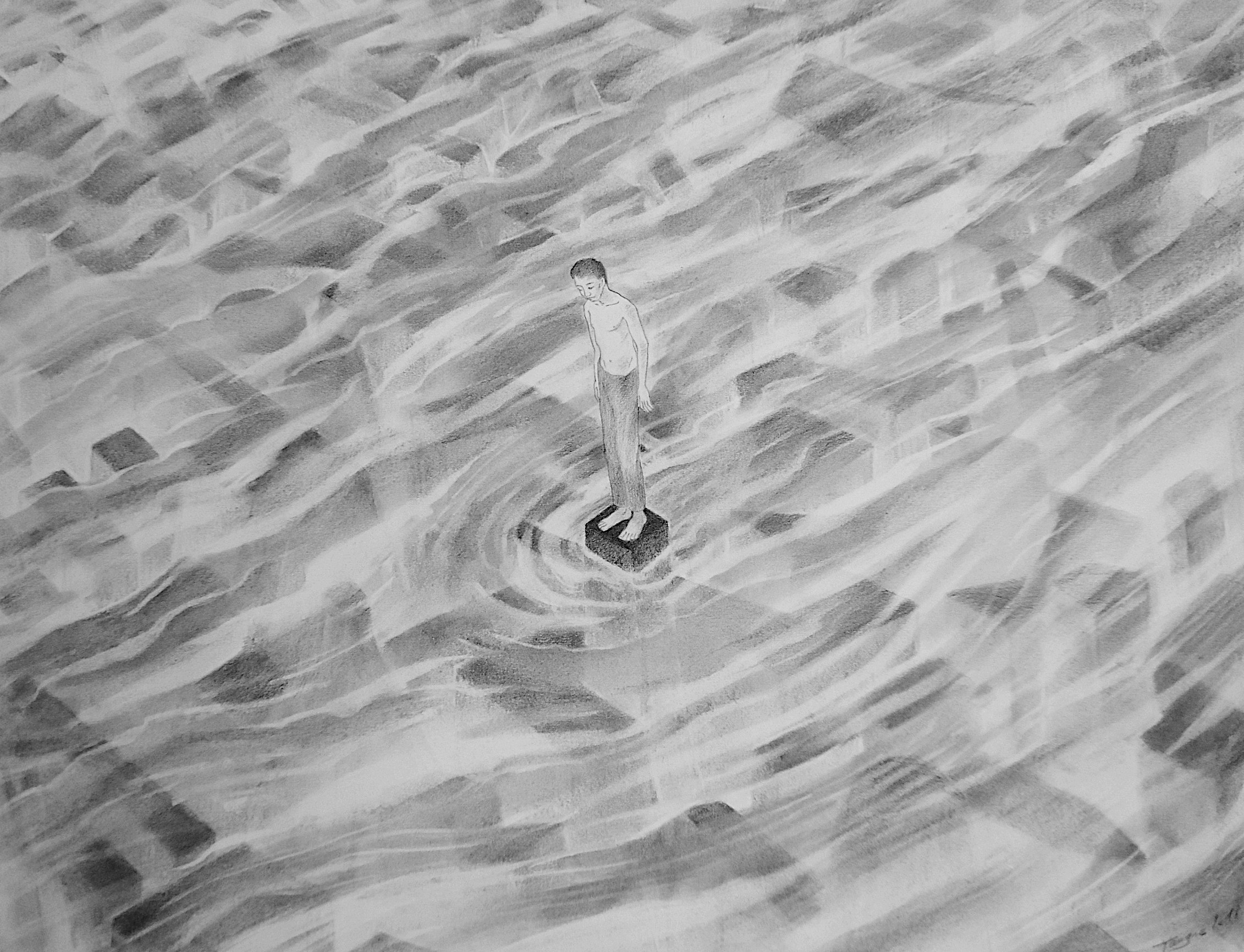 Les dessins autonomes et aboutis que je présente ici, sont comme des focus sur des fragments de l’univers qui est le mien depuis plusieurs années. Le fusain, le crayon graphite mais aussi la gomme, le blanc et le grain du papier agissent un peu comme le révélateur en photographie. Ils sont toujours les agents d’une mise au jour d’une image que j’ignorais et qui se débat entre ombre et lumière. Parfois encore mon travail au fusain se surprend à explorer la noirceur permise par un outil né d’une combustion et qui presque naturellement m’encourage à laisser libre cours à des images habitées par la fumée, le vent, le minéral, la cendre. Le gris et le noir du charbon ou la précision clinique du graphite conviennent à l’introspection comme un contrepoint lucide à la joie ou en tout cas à la vivacité exprimée dans mes peintures plus colorées.