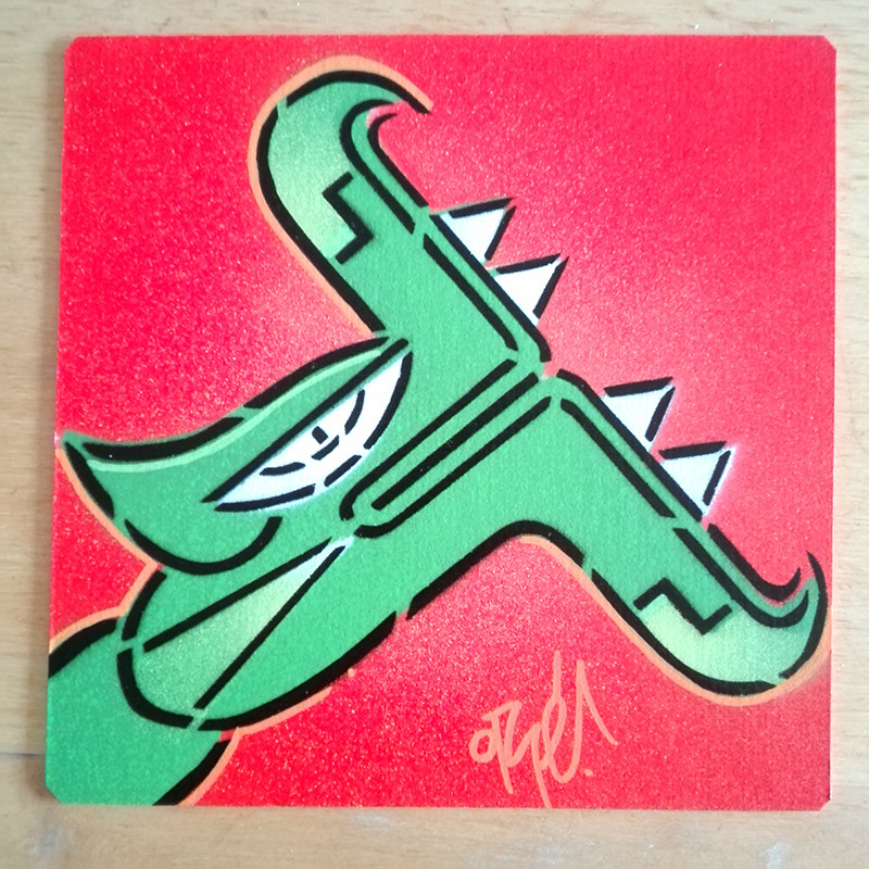 Peinture au pochoir, aérosol et posca sur du carton plume haut grammage / Possibilité de choisir des couleurs spécifiques pour le fond et la tête du Quetzalcóatl / Signé devant et au dos / Daté au dos / Possibilité de dédicacer la pièce