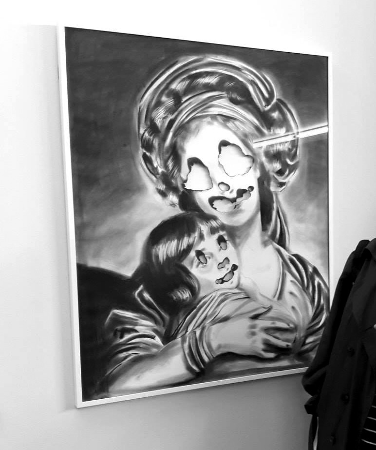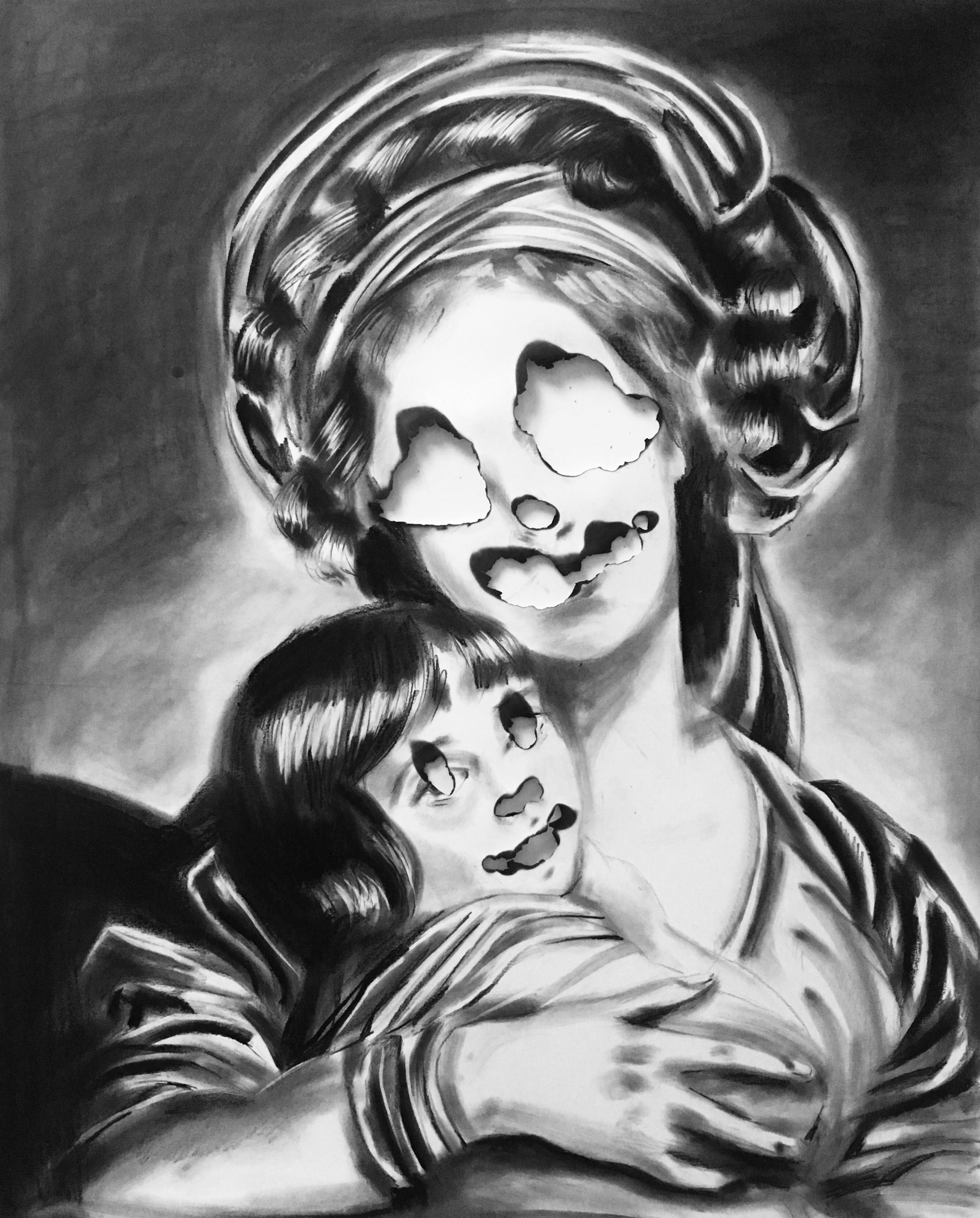 Dessin vendu encadré. - En 1787, Elisabeth Vigée-Lebrun, femme artiste, exposait un autoportrait où elle se met en scène tenant dans ses bras sa jeune petite fille. La douceur et la sérénité de la scène est contrariée par la violence d’un geste radical; les visages de la mère et de l’enfant sont brûlés. L’œuvre est détériorée par le feu. Le papier se consume, faisant surgir chez les protagonistes du tableau des expressions à la fois clownesques, fantomatiques et inquiétantes. Le feu, destructeur et dévastateur, est au contraire ici utilisé pour son potentiel créatif; il re-dessine l’œuvre. Il advient ainsi un tiraillement entre disparition et création, qui participe à rendre ambiguë et presque effrayante, la quiétude originelle de la scène. L’âme des personnages semble ressortir, après avoir disparu dans les flammes en 1918, comme si le drame refaisait surface. - En 2013, sur les murs du musée de Bailleul, Luc Hossepied, directeur de La plus petite galerie du monde [OU PRESQUE], découvre 31 cadres dans lesquels sont exposées des descriptions d’inventaire faites en 1879 par le conservateur du musée Édouard Swynghedauw et qu’avait exhumées Laurent Guillaut en étudiant l’histoire et les collections du musée flamand dont il préparait la renaissance. Ces œuvres détruites en mars 1918, lors du bombardement de Bailleul, inspirent à Luc Hossepied une idée « folle ». À l’occasion de la commémoration de la Première Guerre Mondiale il demande à des artistes d’aujourd’hui de réinterpréter un de ces tableaux-fantômes. Novembre 2018, la Piscine de Roubaix, accueille, pour la neuvième et dernière étape, les 91 œuvres contemporaines qui ressuscitent à leur manière le passé.