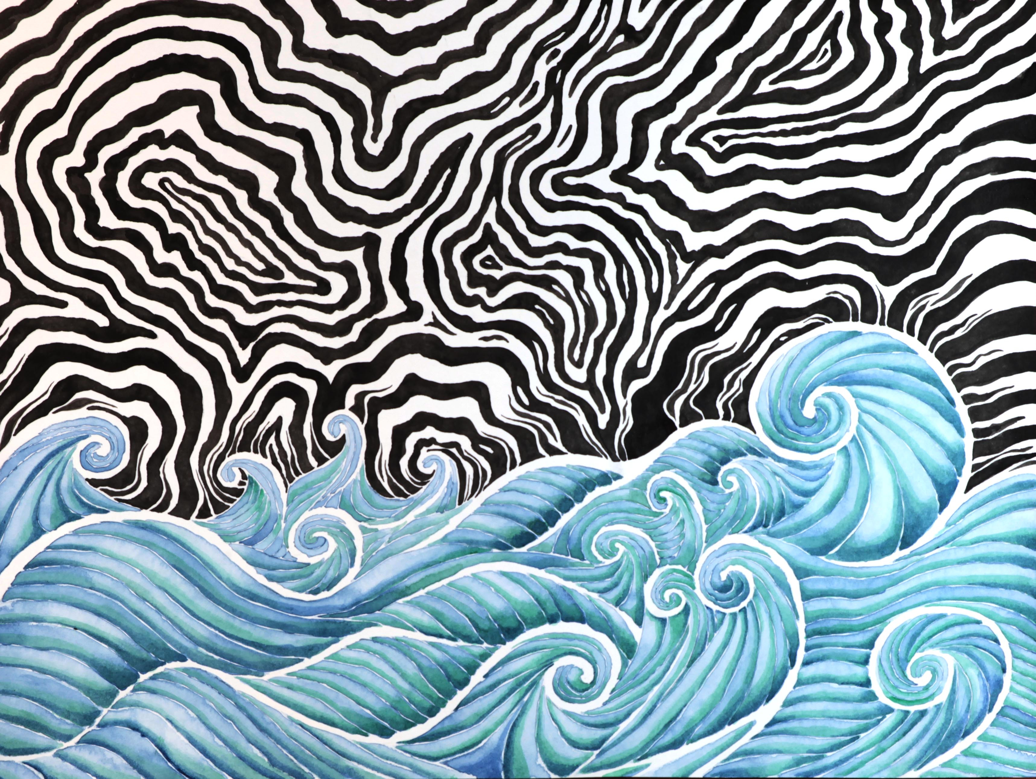 Tempête, encre de chine et aquarelle. Cette pièce fait partie de la série "Bring Color into my life", discussion entre un monde noir-blanc et un constitué de couleur.